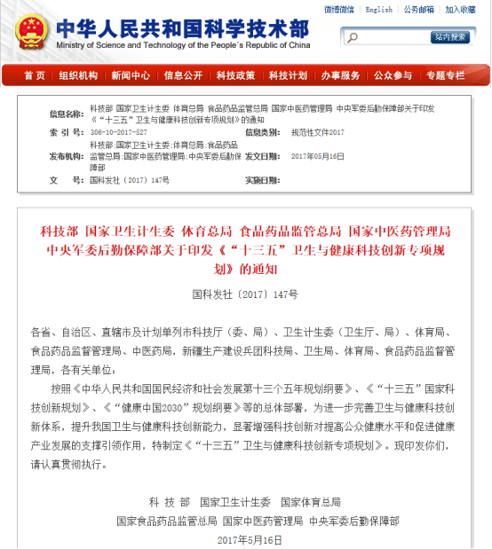 六部委联合发布《“十三五”卫生与健康科技创新专项规划》
