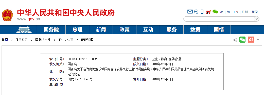 近日,国务院发布《关于在海南博鳌乐城国际医疗旅游先行区暂时调整实施<中华人民共和国药品管理法实施条例>有关规定的决定》。国务院决定,在海南博鳌乐城国际医疗旅游先行区暂时调整实施《中华人民共和国药品管理法实施条例》第三十六条的规定,对先行…